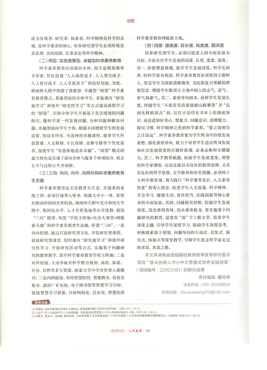 近日,《人民教育》(2025年第2期<总第927期>)以封面文章形式,刊发党委书记谢永红署名文章《研究型高中建设的实践路向与育人策略》,全面介绍学校研究型高中建设历程与成果。