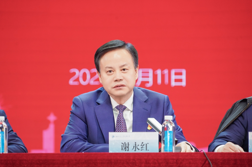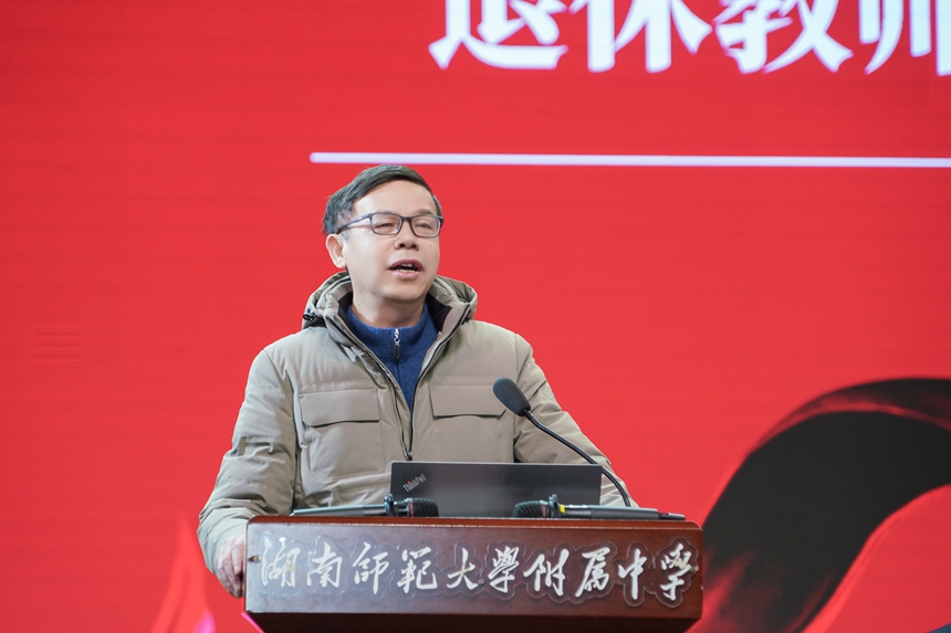 谢永红在荣退仪式上致辞,他代表学校向各位退休同志表达了最崇高的敬意和最美好的祝愿,感谢他们对教育、对附中几十年来的辛勤付出,期待他们今后能通过各种方式为教育、为附中继续发光发热,并祝福他们的退休生活更加美好、更加精彩、更加幸福。