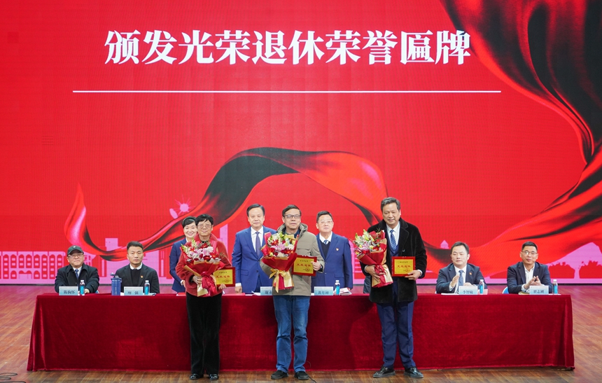 大会首先进行了教职工荣退仪式。校长黄月初宣读了《关于为张比学等15位同志颁发光荣退休荣誉匾牌的决定》,对即将退休的15位教职工表示衷心的感谢和崇高的敬意。在热烈的掌声中,退休教师代表上台接受了光荣退休荣誉匾牌。退休教师代表曾克平老师发表了感言,他深情地回顾了自己在附中工作的岁月,表达了对学校、对同事们的深厚感情和对未来生活的美好憧憬。