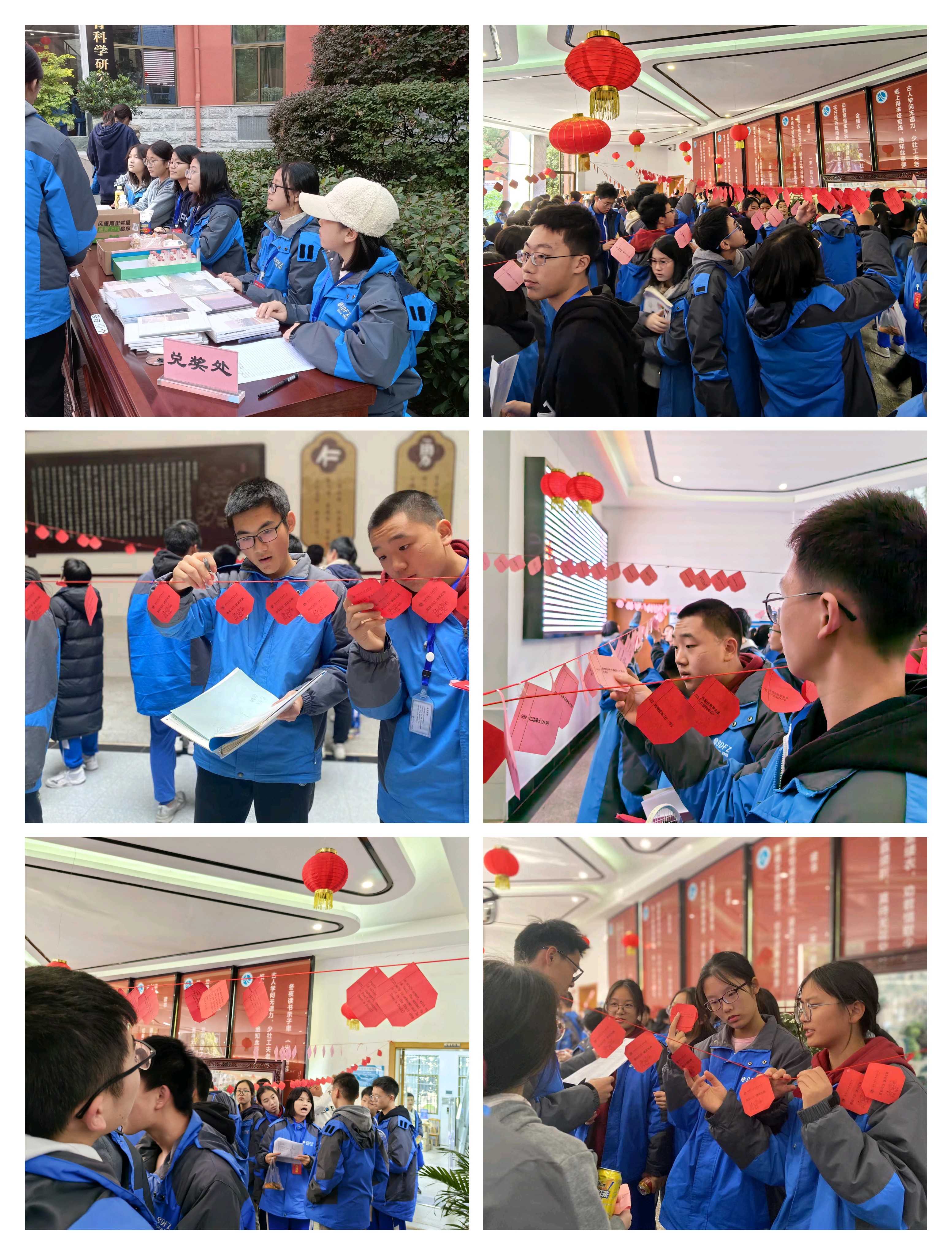 中午时分,图书馆一楼大厅人声鼎沸,暖意洋洋。喜庆的红灯笼高高悬挂,一千多条谜卡粘贴在红线绳上,布满整个大厅。几百名师生穿行于谜卡中,摩肩接踵,热情高昂。同学们沉浸在猜谜的乐趣中,或仰首张望高处的灯谜,或侧身与同伴讨论谜底。猜对的惊喜声此起彼伏,志愿者们忙忙碌碌,努力帮助同学们核对答案。兑奖处也是一遍欢声笑语,尽显节日的欢乐与祥和。
