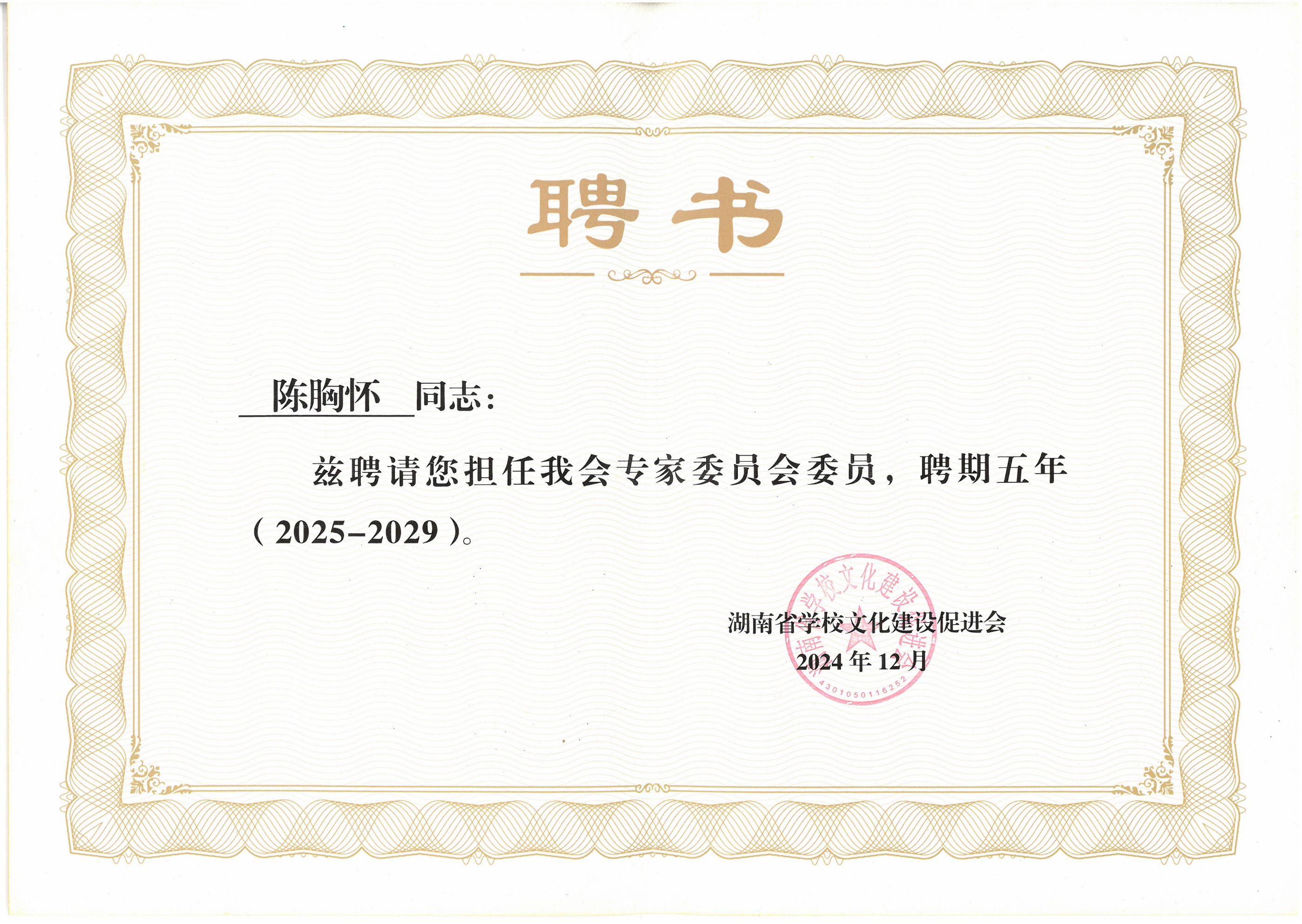 12月15日,湖南省学校文化促进会换届大会在长沙市第六中学举行。来自全省各大、中、小学的近300名会员代表参加了本次换届选举。省文旅厅、省民政厅领导出席会议并讲话。我校党委委员陈胸怀做成果分享并被聘为湖南省学校文化促进会专家委员会委员。