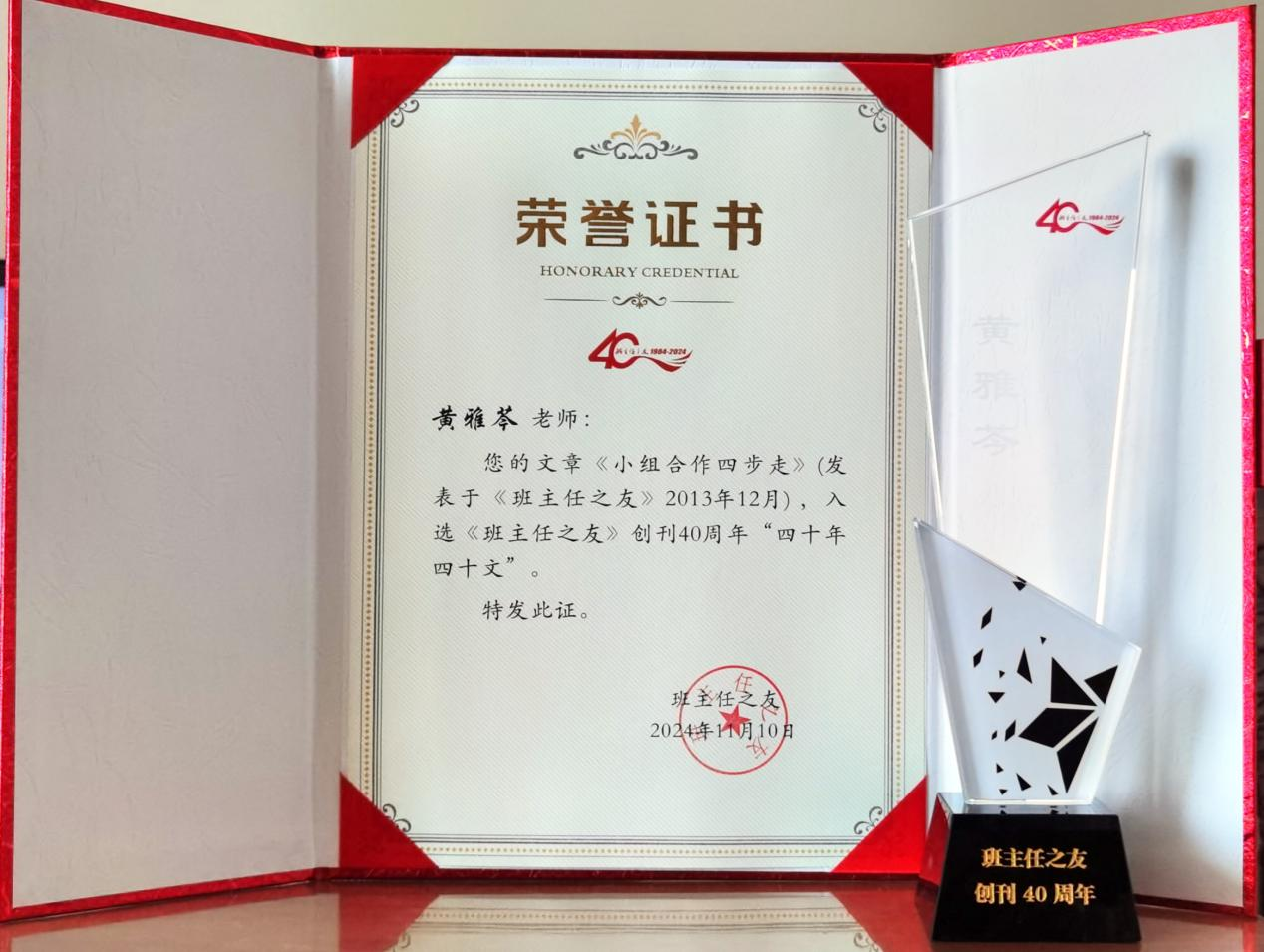 《班主任之友》杂志社在发刊以来的15000篇文章中严格甄选,评选出能反映近40年教育改革重要节点并具有创新实践和时代影响的40篇论文,组织了创刊40周年“四十年四十文”颁奖活动。黄雅芩老师的文章《小组合作四步走》(发表于《班主任之友》杂志2013年第12期)成功入选。大会颁奖词指出:进入21世纪,小组合作学习被广大教师广泛运用到课堂教学中,鲜见班级管理中的实践及论述。此文从班级管理的角度,对小组的构建、职能、发展、评价提出了建设性、可行性策略——动态建构小组,让小组可持续;拓宽小组职能,全面关注班级生活;针对捆绑式评价的正负效应,完善评价激励体系。这些探索与思考、理念与实践至今依然具有极强的实践性与引导性。