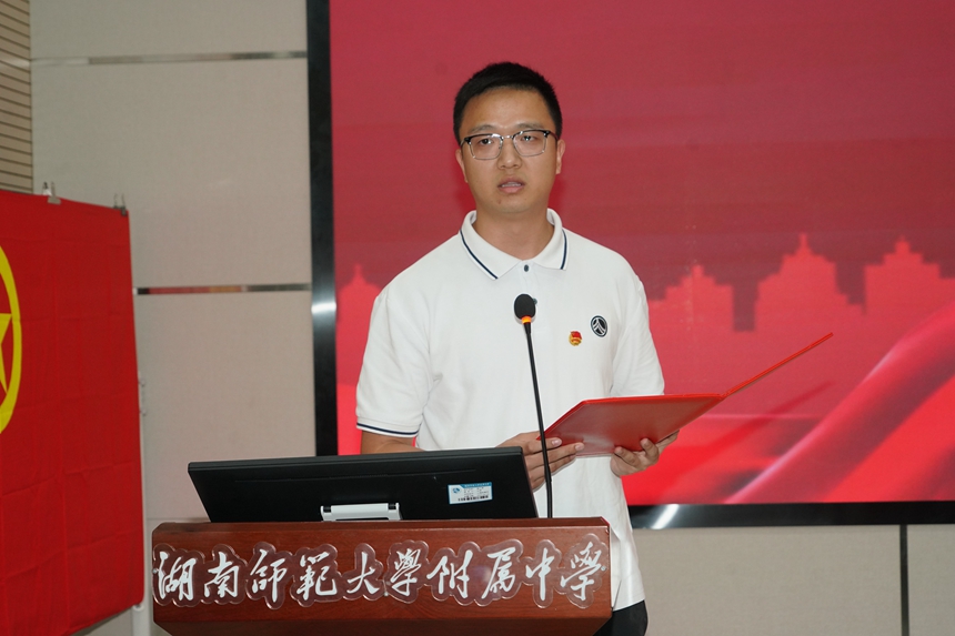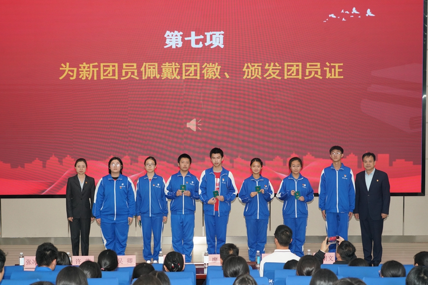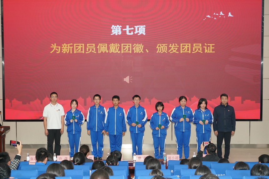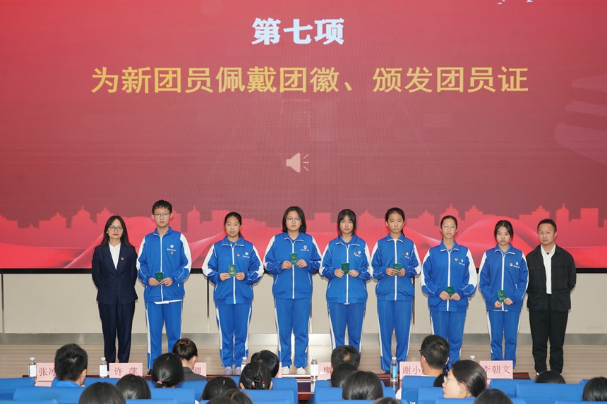 廖强宣读团总支、各团支部成立的决定以及九年级团员名单。与会领导、老师为21名新团员颁发团员证、佩戴团徽。