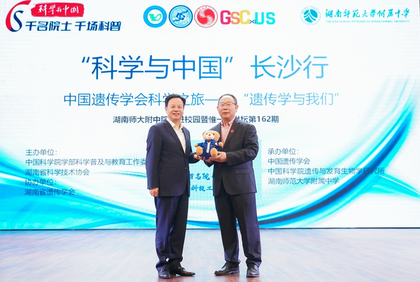活动过程中,谢永红向杨维才院士赠送了附中吉祥物——“附中熊”,并与我校科学副校长刘艳平教授一起,向刘欢等中国遗传学会科普宣讲团专家颁发了“科学教育导师团专家”聘书。