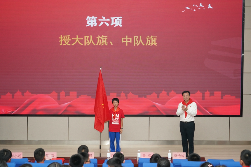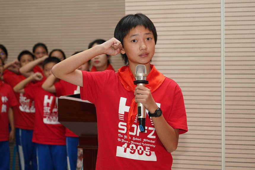 队员们举起右拳,在大队长钟子欣带领下重温入队誓词,向着队旗庄严宣誓。