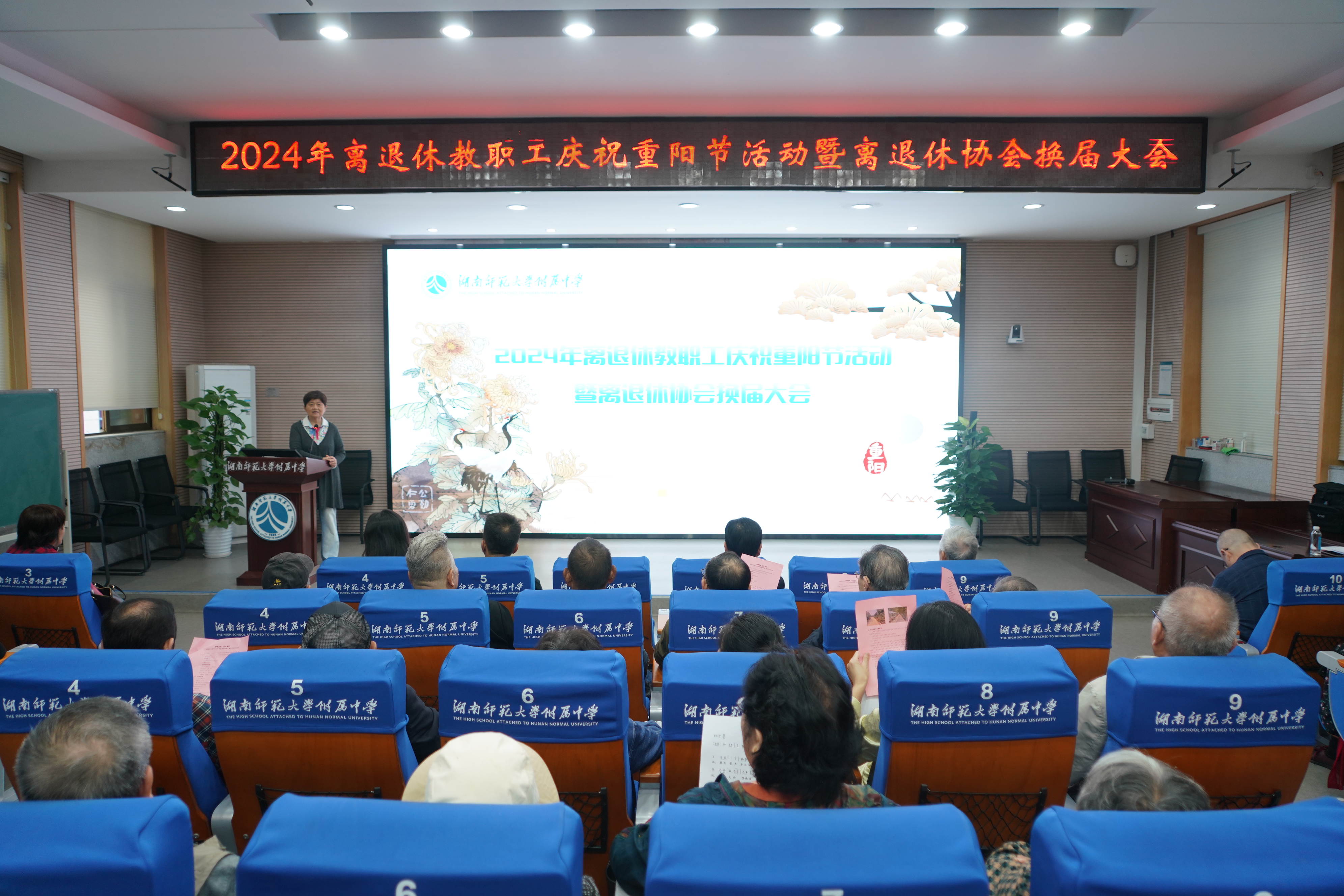 10月10日,湖南师大附中离退休教职工庆祝重阳节活动暨离退休协会换届选举大会在学校图书馆报告厅举行。党委书记谢永红、副校长兼工会主席廖强出席会议,会议由离退休协会副会长苏华主持。首先协会会长蔡卫红对离退休协会三年来的工作进行了总结,随后工会副主席谭伟就协会换届进行说明,并进行了现场的换届选举工作,产生了新一届离退休协会的委员共12名委员,副校长兼工会主席廖强对此次换届大会的顺利召开表示祝贺!向长期为附中教育事业付出辛勤劳动的全休离退休教职工表示衷心感谢!祝福离退休教职工身体健康,合家幸福!重阳节快乐!希望新一届离退休协会委员能够共聚银发力量,共创美好未来。为附中120年校庆建言献策。
