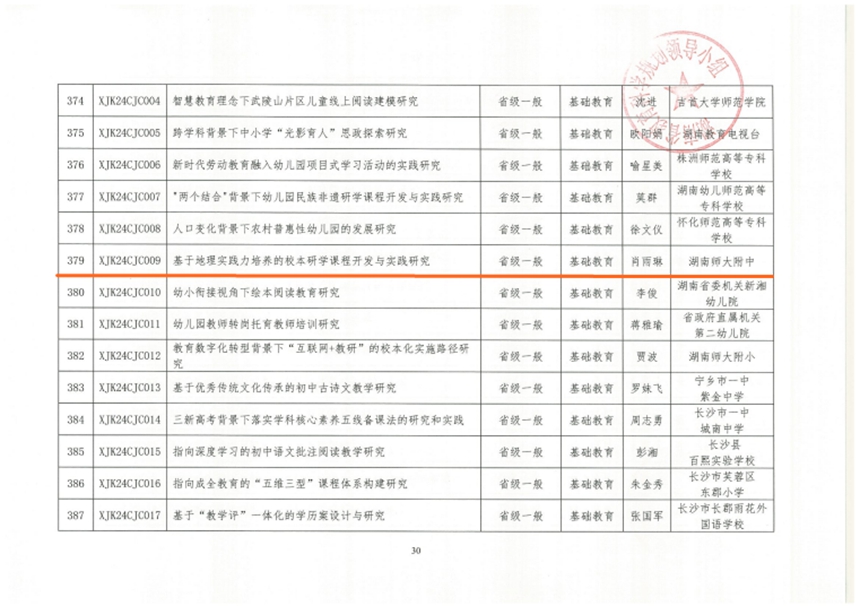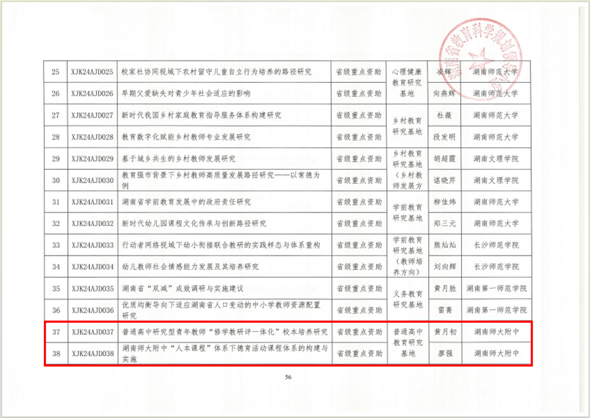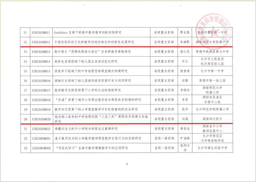 湖南省教育科学规划领导小组近日下发《关于下达湖南省教育科学“十四五”规划2024年度立项课题的通知》(湘教科规通[2024]4号)和《关于下达湖南省教育科学“十四五”规划2024年专项课题的通知》(湘教科规通[2024]7号),我校六项课题获准正式立项。其中,校长黄月初主持的课题《普通高中研究型青年教师“修学教研评一体化”校本培养研究》(课题批准号XJK24AJD037)、副校长廖强主持的课题《湖南师大附中“人本课程”体系下德育活动课程体系的构建与实施》(课题批准号XJK24AJD038),被立项为省级重点资助课题;语文教研组肖莉老师主持的课题《大单元视域下高中语文思辨写作教学实践研究》(课题批准号XJK24BJC014)被立项为省级一般资助课题;地理教研组肖雨琳老师主持的课题《基于地理实践力培养的校本研学课程开发与实践研究》(课题批准号XJK24CJC009)被立项为省级一般课题;科技创新中心副主任李湘黔主持的课题《中国传统科技文化的教育创造性转化和创新性发展研究》(课题批准号XJK24ASM012),科研与教师发展处副主任向超主持的课题《指向核心素养的中学地理实践“三层三类”课程体系构建与实施研究》(课题批准号XJK24ASM020),被立项为省级重点资助课题。