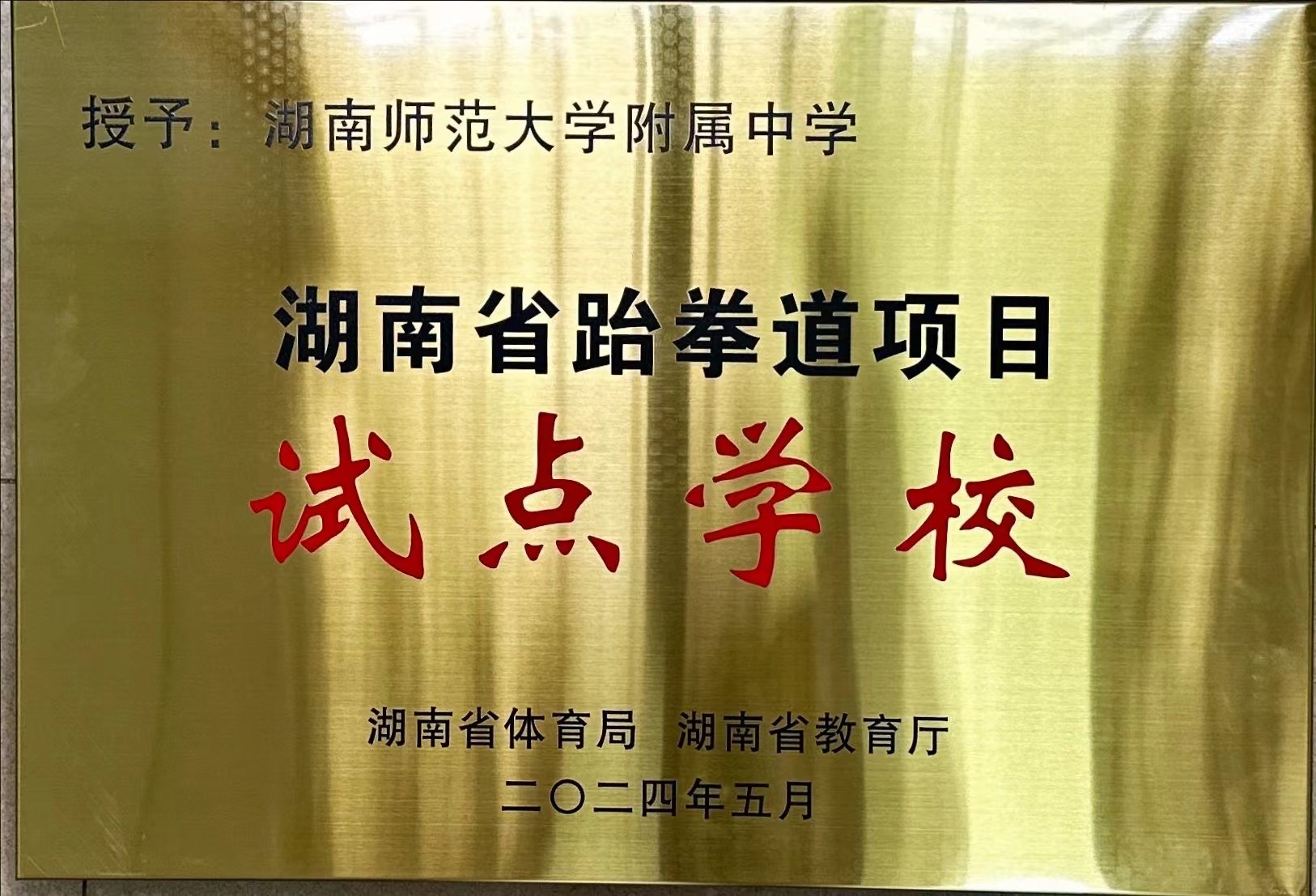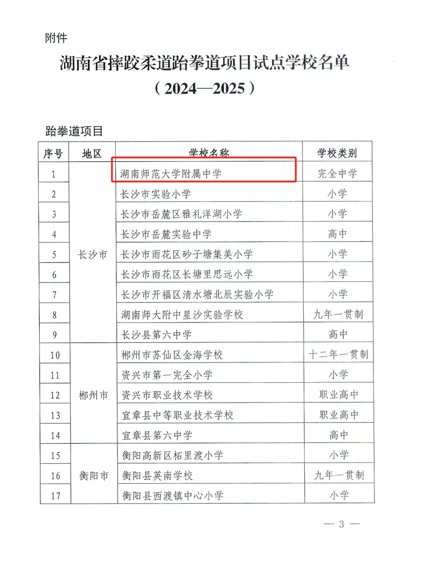 根据湖南省体育局、湖南省教育厅联合印发的《关于开展全省摔跤柔道跆拳道项目试点学校自评和新申报试点学校认定工作的通知》要求,按照学校自愿申报、县市区主管教育行政部门推荐、市州体育、教育部门资格审核、省级认定等程序,经对全省93所申报学校严格遴选,我校经过湖南省体育局、湖南省教育厅的各项检查和严格考核,被认定为“湖南省摔跤跆拳道项目试点学校”。