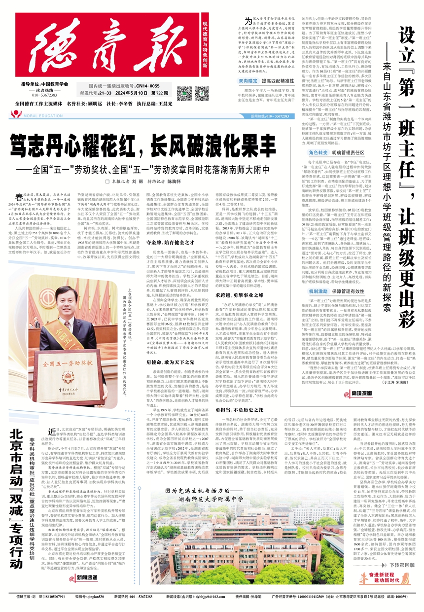 【德育报】笃志丹心耀花红,长风破浪化果丰——全国“五一”劳动奖状、全国“五一”劳动奖章同时花落湖南师大附中 来源:未知 发布时间:2024-05-10 浏览次数: 次 【字体:小 大】 点赞 收藏 分享到: 【打印正文】 相关内容