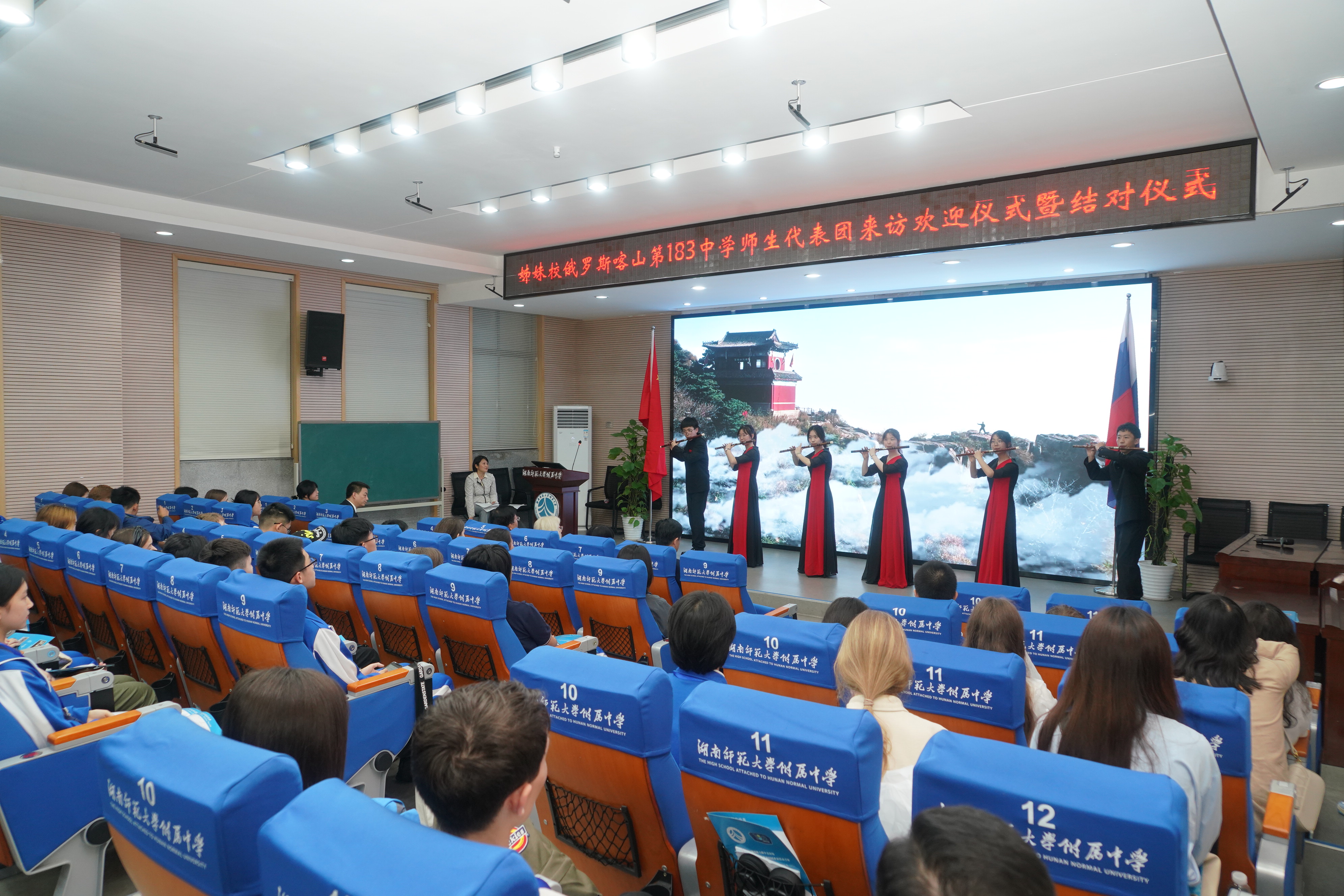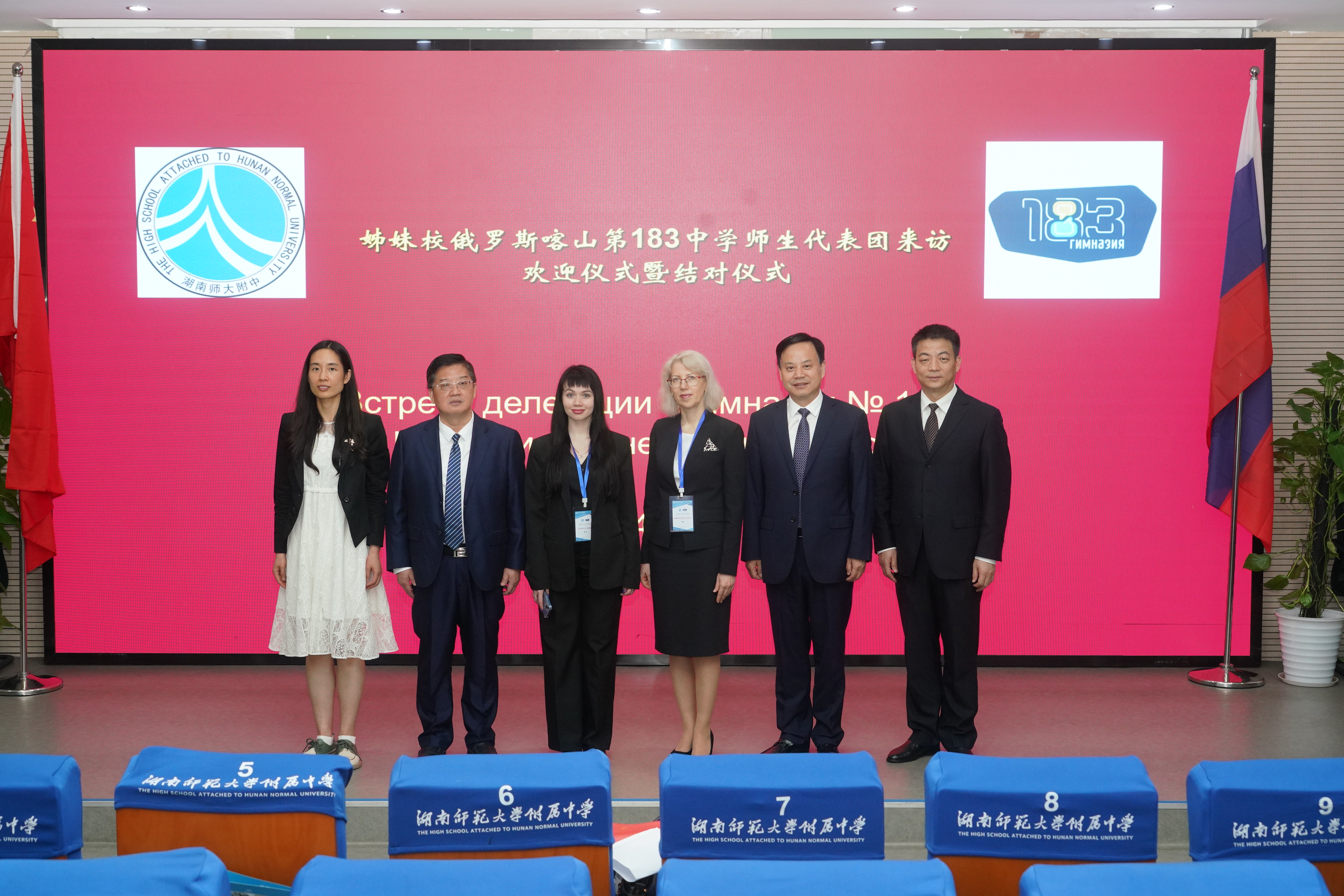 4月16日下午,在我校之谟图书馆进行了盛大的欢迎仪式暨结对仪式。我校党委书记谢永红、校长黄月初、副校长苏建祥出席。校本课程俄语班的师生们,20位附中结对学生和他们的家长们,与俄罗斯师生们一同参与这项仪式。附中红枫民乐团和我校街舞社的学生代表就为远道而来的客人们从传统、现代两个方面展示了附中学生的才华横溢、充满活力。我校学生郭紫姝的俄文分享和第183中学学生伊力汗学生的中文分享更是将欢迎仪式推向高潮。仪式上,Natalia副校长代表第183中学向我校领导赠送了具有特色和纪念意义的礼物。双方领导致辞都表达了非常珍视两校之间的友谊,期待未来有更多友好合作。