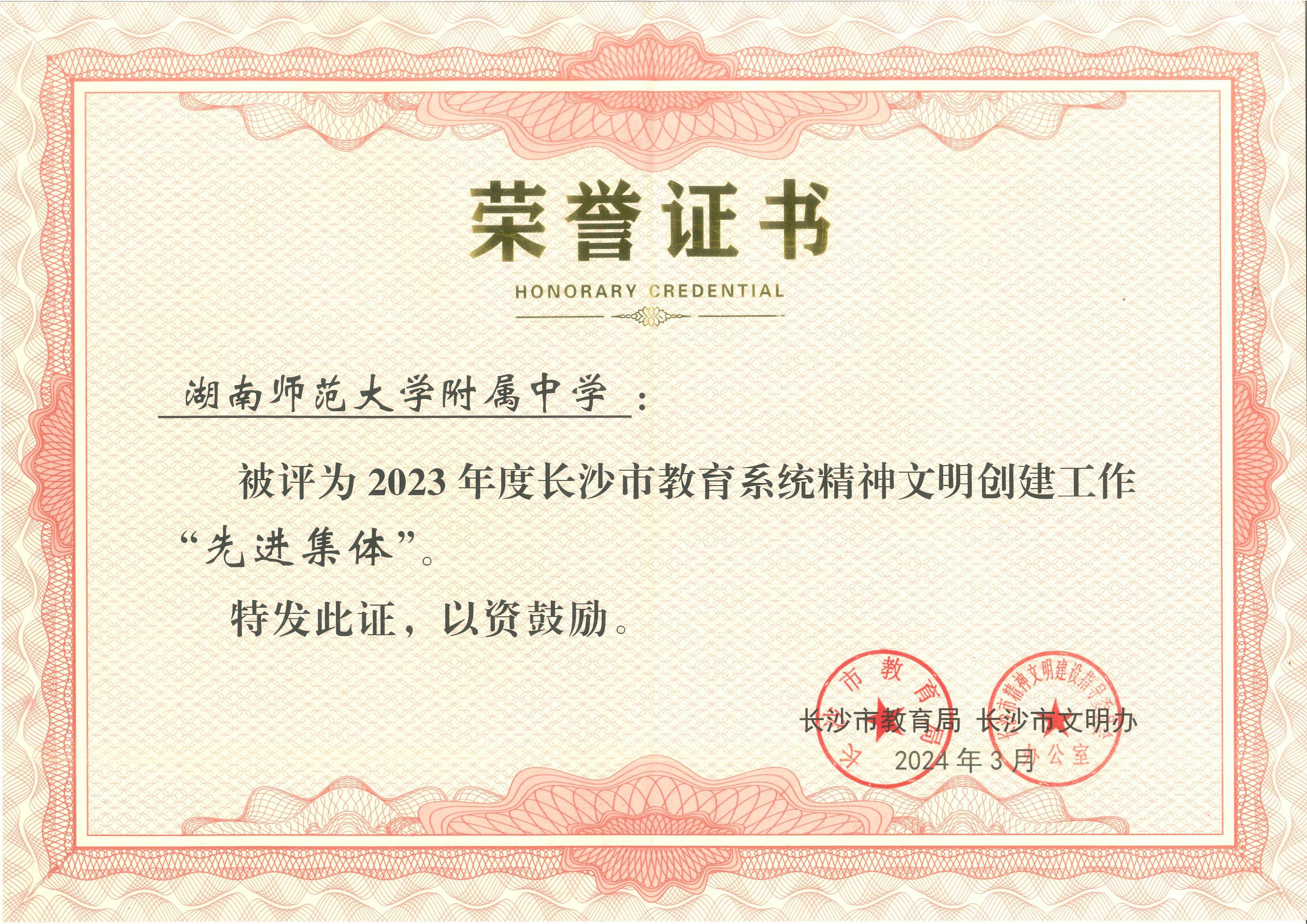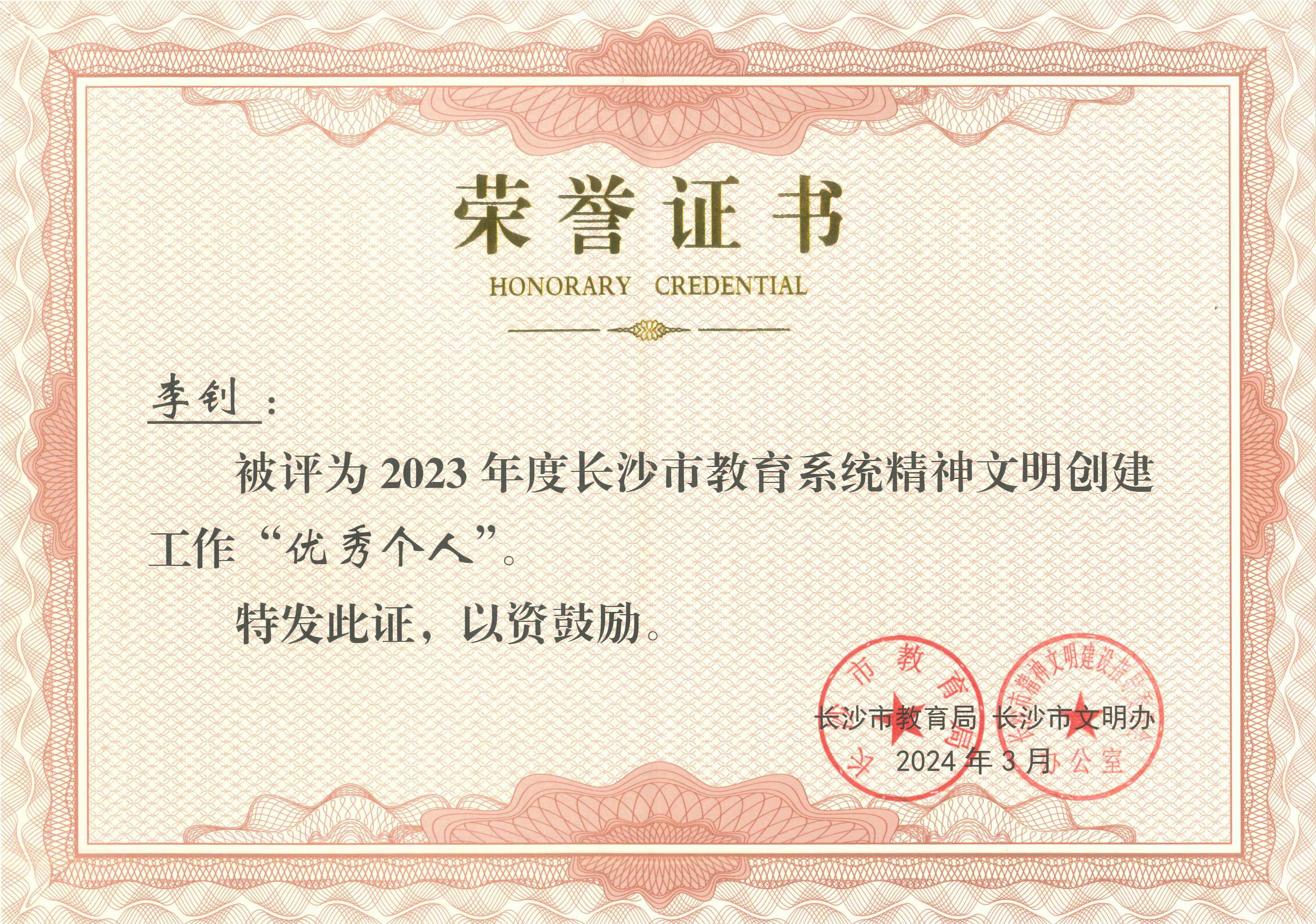 近日,长沙市教育局公布《2023年度长沙市教育系统精神文明创建工作先进集体和优秀个人评选结果通报》,我校获评2023年度文明创建工作“先进集体”,李钊同志获评2023年度明创建工作“先进个人”。