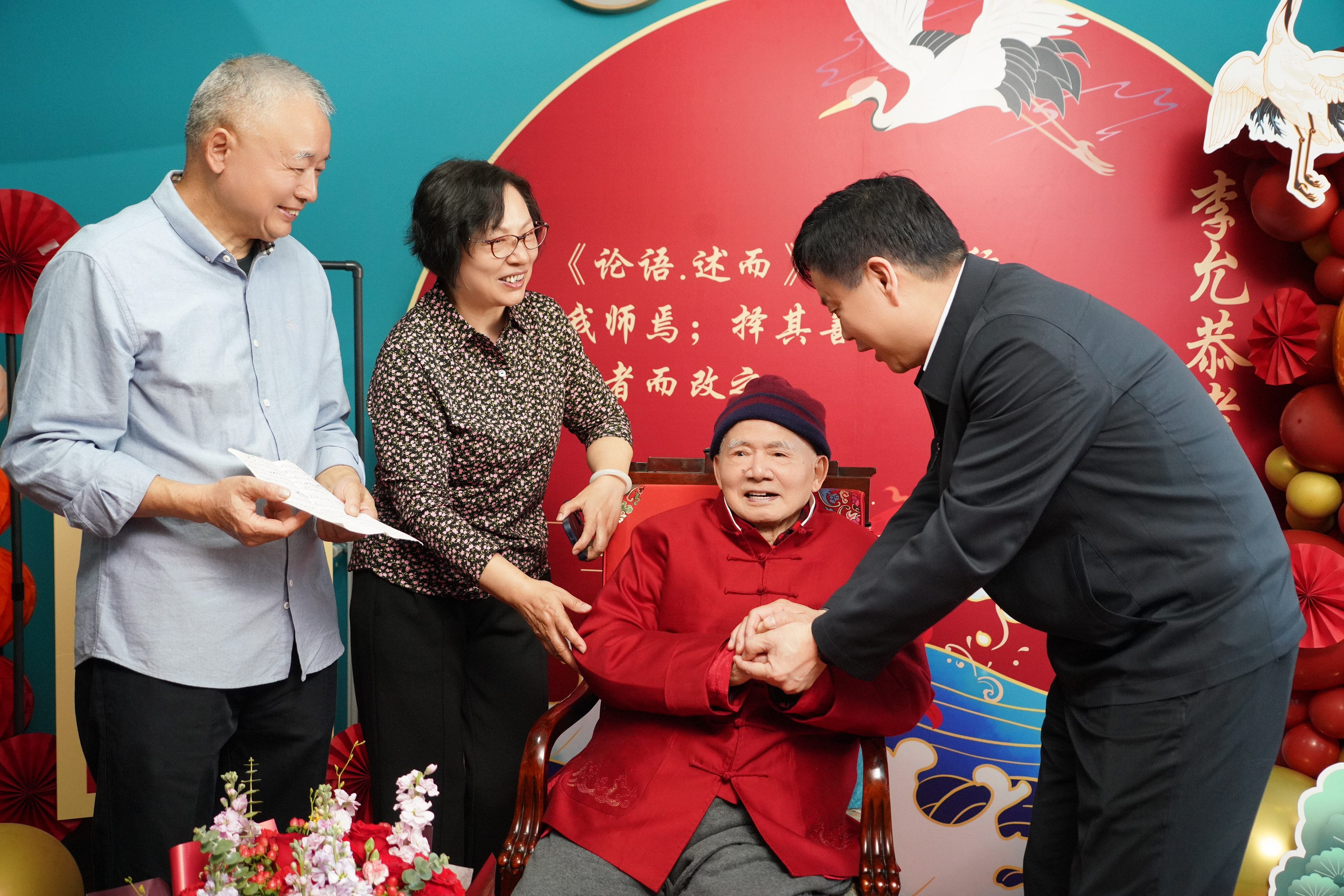仪式现场,李允恭教过的许多学生也一同见证,为老师庆贺。“李老师是严师慈父,不仅关注学习,对每一个人的家庭情况也十分了解。他上课充满热情,顺着他的话语我们如同走入课本。进高中时语文是我的弱项,但高考考的很好。”80届校友邓春林说:“李老师90岁生日时,我们去祝贺,他一眼就认出了我,还对我学生时代的家庭情况如数家珍,可见真是把每一个学生记在了心底。”“谢谢您李老师,您是后辈们学习的榜样,是践行立德树人的旗帜”谢永红握着李允恭的手说:“有了您的助力和支持,我们老师干劲更足,咱们学校也会越办越好。”