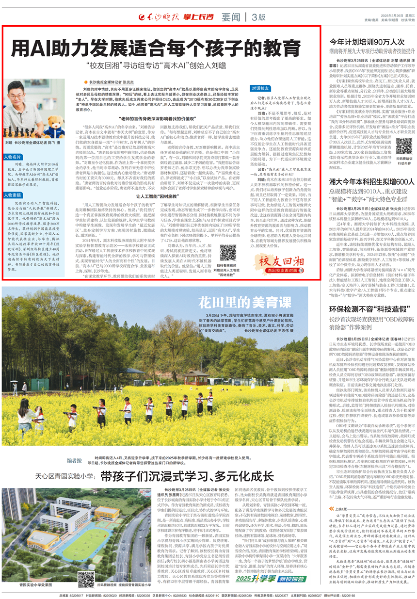 【长沙晚报】用AI助力发展适合每个孩子的教育|“校友回湘·杰出校友面对面”专栏