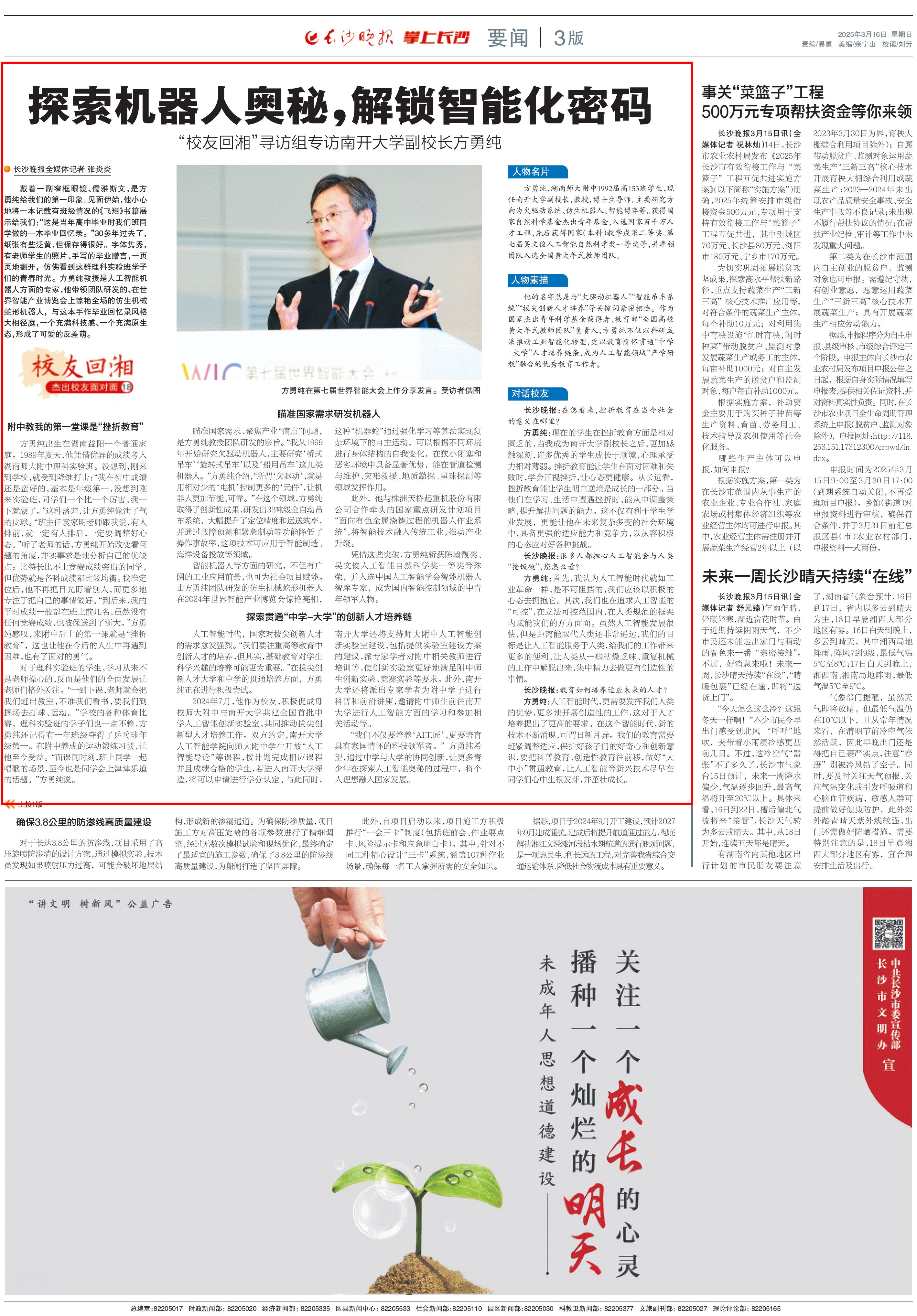 “我们不仅要培养‘AI工匠’,更要培育具有家国情怀的科技领军者。”方勇纯希望,通过中学与大学的协同创新,让更多青少年在探索人工智能奥秘的过程中,将个人理想融入国家发展。