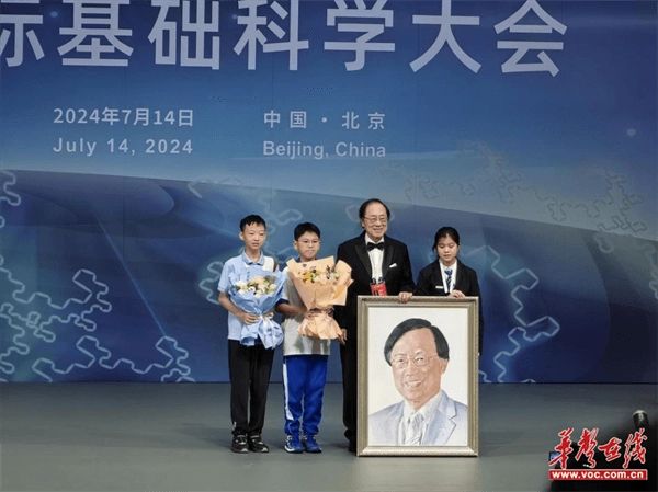 在开幕式颁奖典礼上,安德鲁·怀尔斯等六位当代杰出科学家获颁基础科学终身成就奖。湖南师大附中学子与来自全国十余所学校的14位中学生登台,向这些获得终身成就奖的科学家献上为他们绘制的油画并合影留恋。