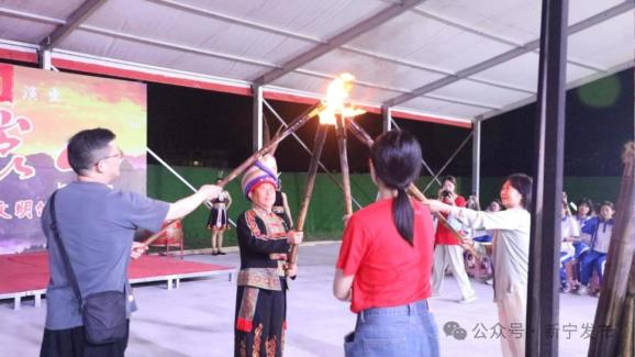 在瑶族篝火晚会,演出人员为师生们带来了别开生面的瑶族文化节目,并邀请带队老师高举火把,点燃篝火。学生们也被现场的气氛感染,轮番上台表演自己精心准备的节目,台下掌声和欢呼声此起彼伏,氛围温馨而热烈。