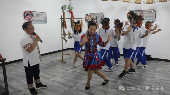 在瑶族非遗文化课堂上,瑶族非遗传承人身穿传统服饰,向学生们展示瑶族峒歌,介绍竹龙等非遗手工制作,并邀请同学们上台学习体验傩面舞。傩面色彩分明、表情丰富,学生们戴好面具后,跟随传承人的脚步,欢乐地舞动着自己的身体,动作从生疏到熟悉,模仿得惟妙惟肖。
