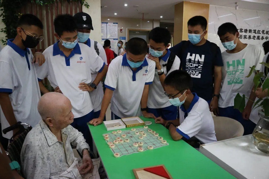 近期,还有很多班级也自发地前往社区居家养老服务中心开展各种活动,如下象棋、用轮椅带老人散步、陪老人们说笑解闷,有的还帮助养老中心的工作人员运送货物。在深入交流中,同学们了解到了这群老人们当年是如何为新中国挥洒青春、造福社会,更加坚定了做一个品学兼优、心怀天下、不负韶华的社会主义新时代的优秀青年。