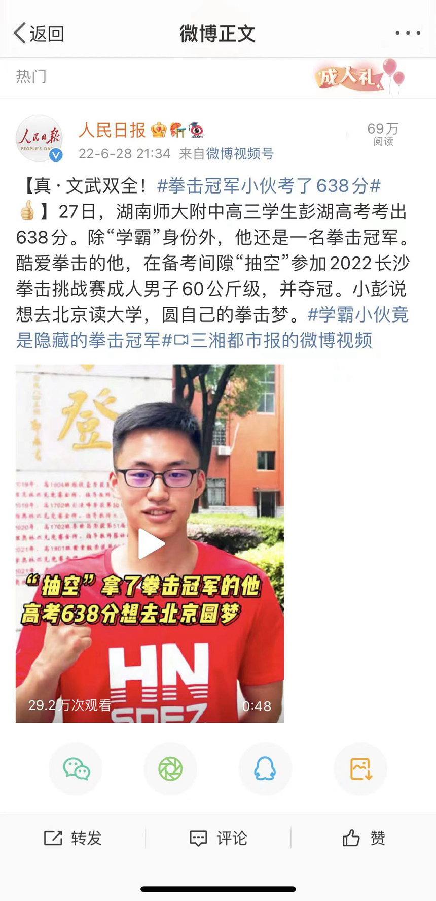 【人民日报】“拳”力以赴!高考638分!他是学霸也是拳击冠军
