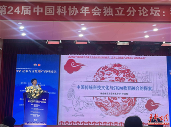 华声在线6月27日讯(通讯员 彭如良)6月26日至27日,第24届中国科协年会在湖南长沙开幕,年会独立分论坛“科学、艺术与文化遗产高峰论坛”在中南大学召开。年会上,湖南师范大学附属中学特级教师李湘黔作为基础教育界唯一代表,作了专题报告《中国传统科技文化与STEM教育融合的探索》,引起听众积极的反响,线上和线下都进行了热烈的讨论。
