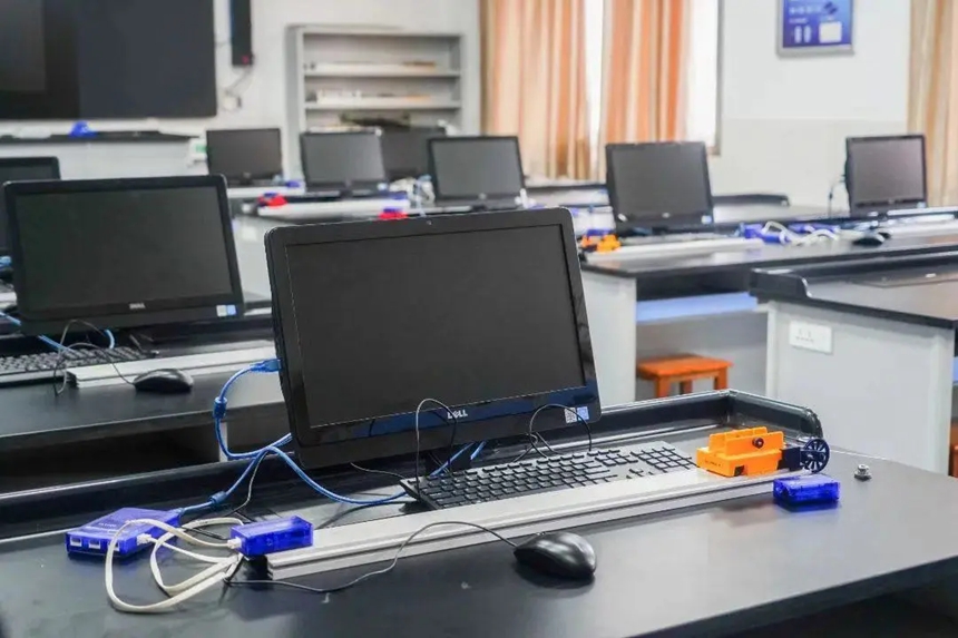 物理数字化实验室配备光电门、位移传感器、电流传感器、电压传感器等数字化仪器,每个展台上均配有电脑。这里开设了探究加速度与力、质量的关系、探究平抛运动、探究向心力影响因素等分组实验,同学们利用数字化仪器可以更快、更准确地测量相关物理量,使得实验操作更加方便,实验测量更加精确,数据处理更为高效。