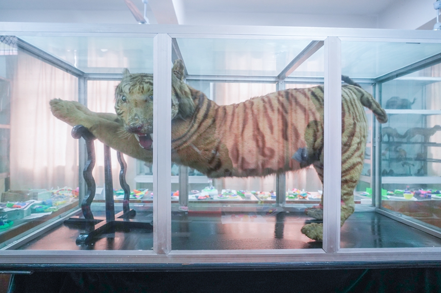 05、标本馆 如果做完实验觉得还不够,还可以来标本馆看看,内藏有上百件鸟兽标本。你知道长沙人为什么称腐乳为猫乳吗?因为岳麓山上曾经真的有老虎,以至于老百姓谈虎色变。在做完试验后可以看看实验室的镇馆之宝,长沙的最后一只老虎。