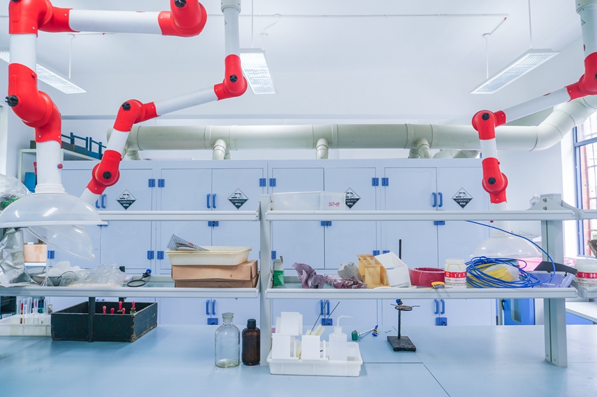 两间化学实验准备室通风设施完备,如配备了高大上的通风柜、万向抽气罩和喷淋塔等,它们目的是去除净化由实验产生的烟气、气雾、微粒及其有害气体。在准备室内拥有各种你想都不敢想的神奇的化学物质,只要你想看任何物质之间的变化,都可以在这里准备并实现。完善的设备充分保证了所有实验正常进行,在这里你可以准备常规和点水成冰、可乐消失和魔棒点火等兴趣预备实验。