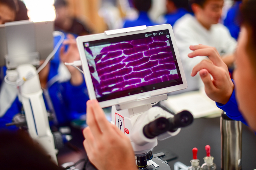 互动显微镜教室共有28套交互式显微镜和互动平板电脑,同学们可以借助先进的显微镜观察各种细胞的结构,观察细胞在不同环境以及不同时期的变化,比如植物细胞在盐水中质壁分离,细胞的有丝分裂等。还可以通过互动平板与老师、同学们分享你观察到的影像。