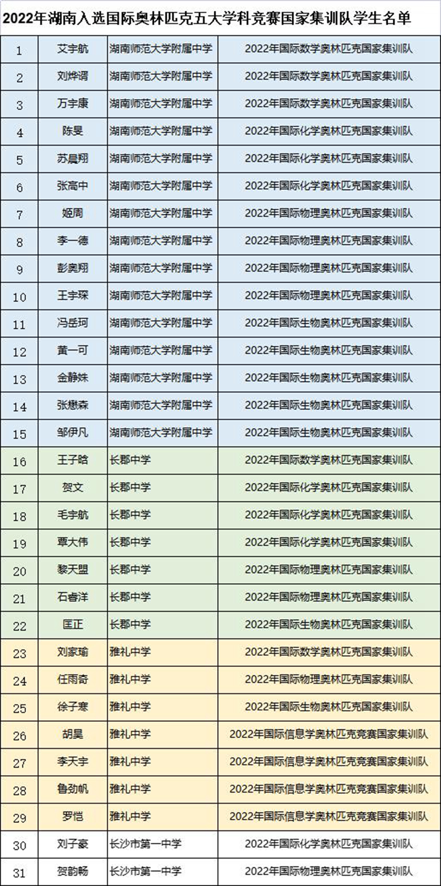 长沙晚报掌上长沙3月18日讯(全媒体记者 舒文)今日,中国科协青少年科技中心发布2022年国际奥林匹克五大学科(数学、物理、化学、生物以及信息学)竞赛国家集训队名单,全国共有260名学生入选。湖南作为竞赛强省今年取得了不俗的成绩,共有31名学生入选,总人数居全国第二。
