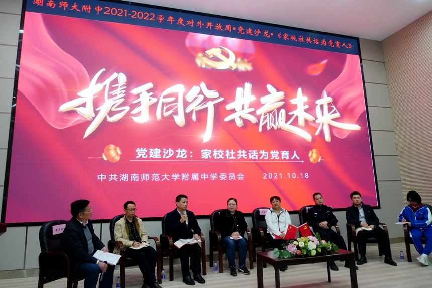 10月18日下午,在湖南师大附中举行了一场别开生面的党建沙龙:家校社共话为党育人,湖南师大附中党务工作者、社区、家长、教师代表共同商议在“双减”背景下如何充分发挥家庭、学校、社会的作用和优势,以家校社协同育人机制新格局为“双减”提升支撑保障能力,用线上线下直播联动的方式互学共享促提升。