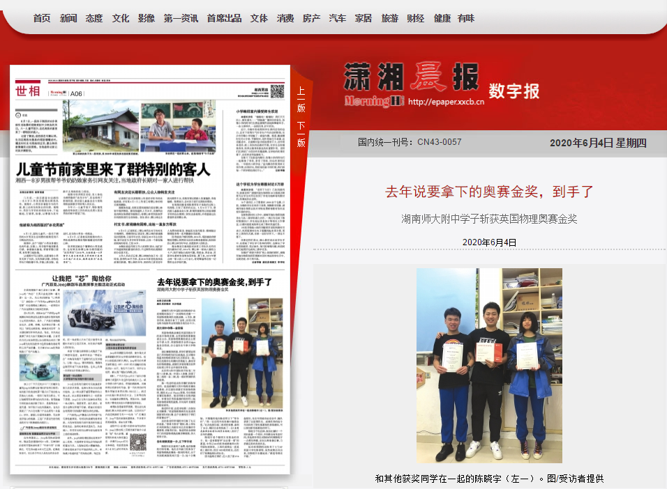 湖南师大附中国际部的陈晓宇在疫情期间参加了一次特殊的竞赛——英国物理奥林匹克挑战赛。6月份,喜讯传来,陈晓宇拿下了金奖,这项大奖也将为他报考全球顶级名校加分不少。
