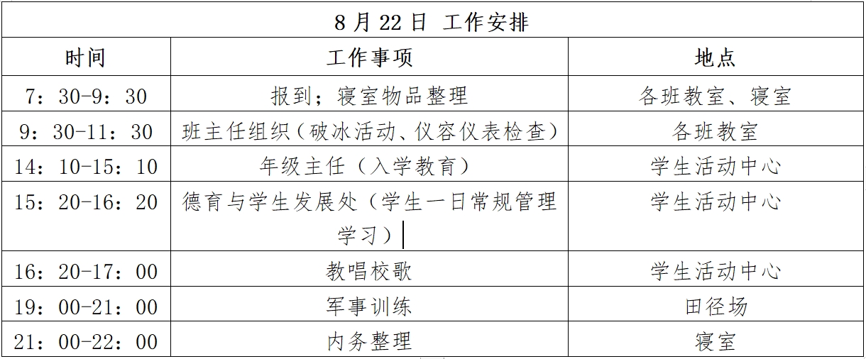 (1)8月22日7:30-9:30所有学生将行李放置到宿舍并整理床位。