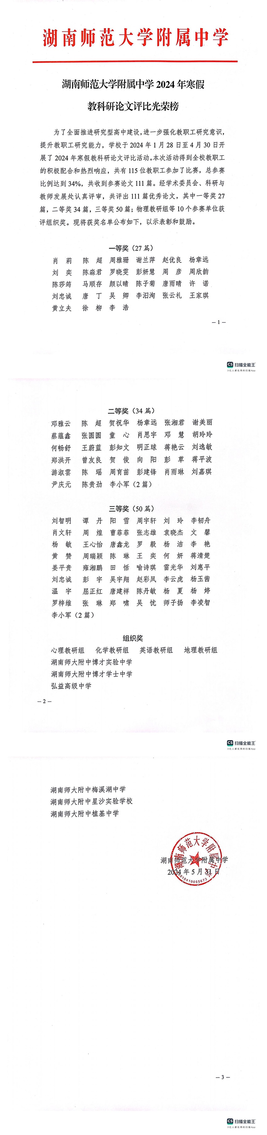 湖南师范大学附属中学2024年寒假教科研论文评比光荣榜