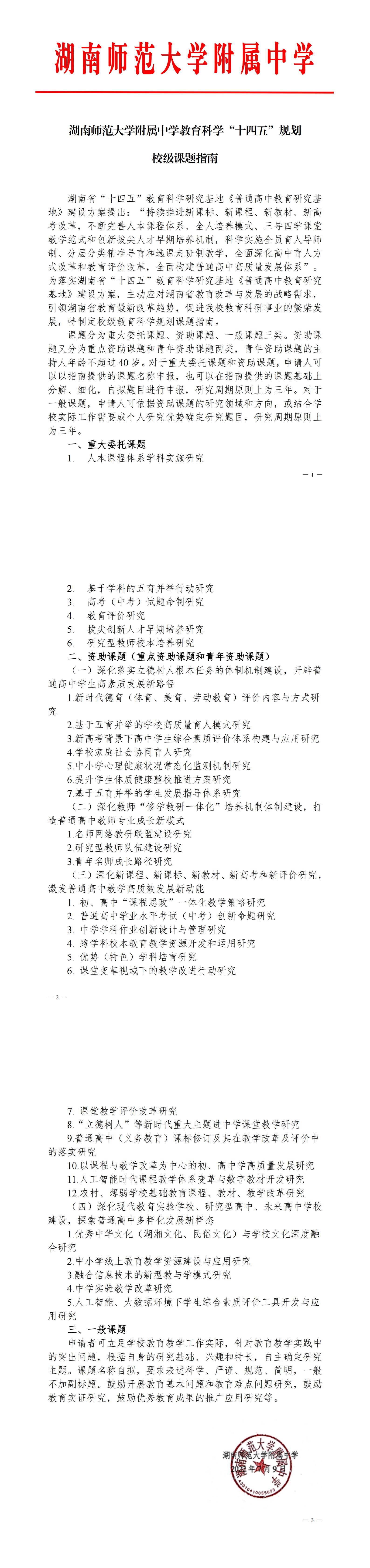 湖南师范大学附属中学教育科学“十四五”规划校级课题指南