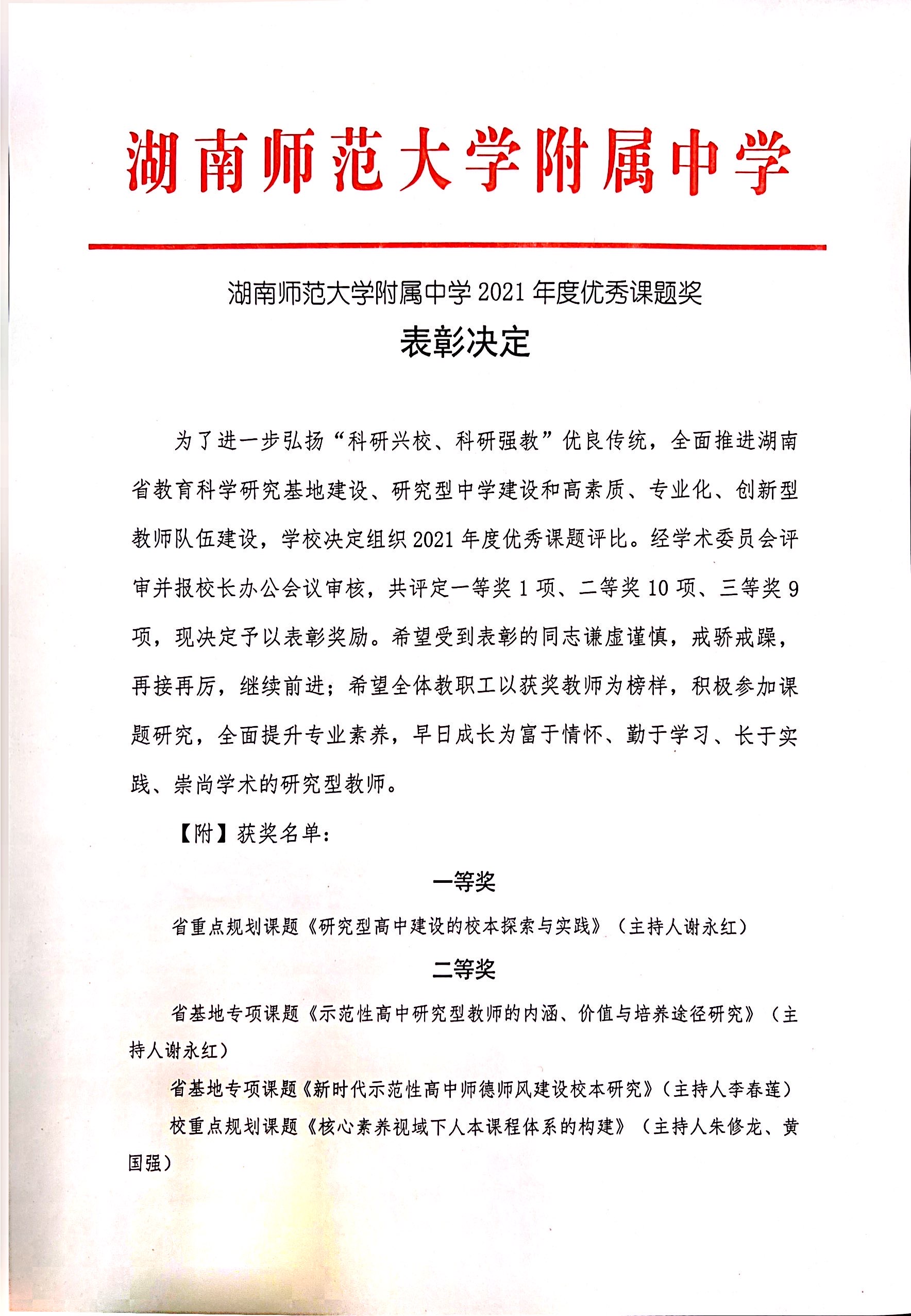 湖南师范大学附属中学2021年度优秀课题奖表彰决定