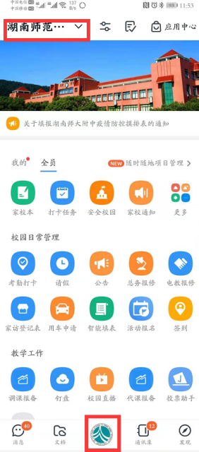 3.如果您的“钉钉”账号已加入过其它组织,则需要切换至“湖南师范大学附属中学”,点击工作台左上角即可切换,如下图所示: