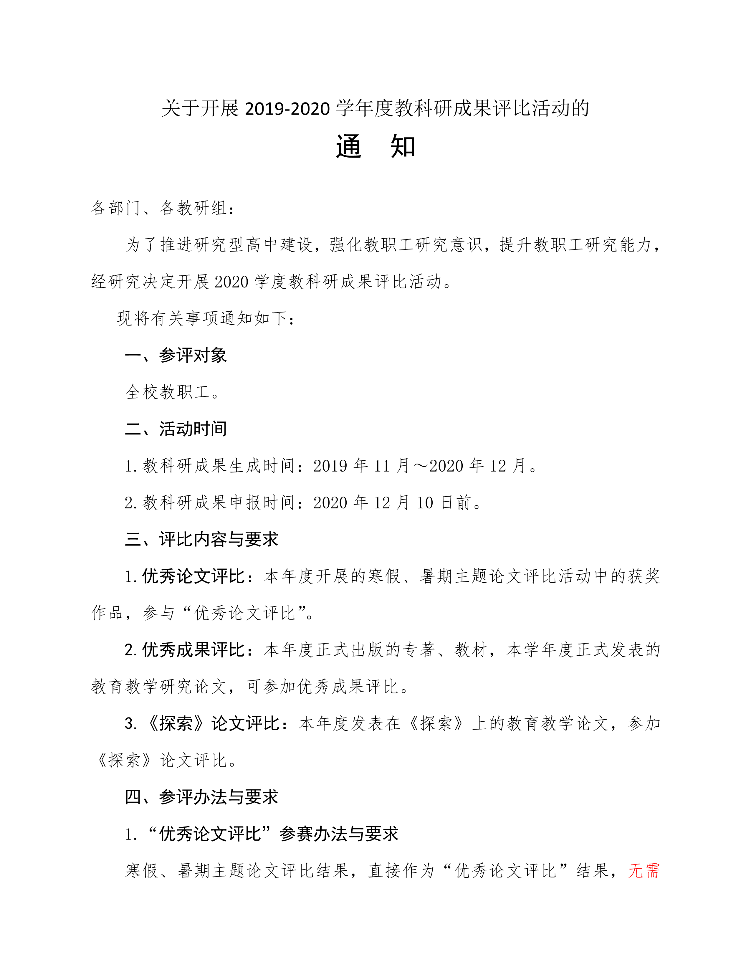 关于开展2019-2020学年度教科研成果评比活动的通知