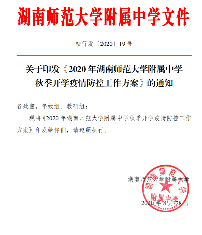 关于印发《2020年湖南师范大学附属中学 秋季开学疫情防控工作方案》的通知