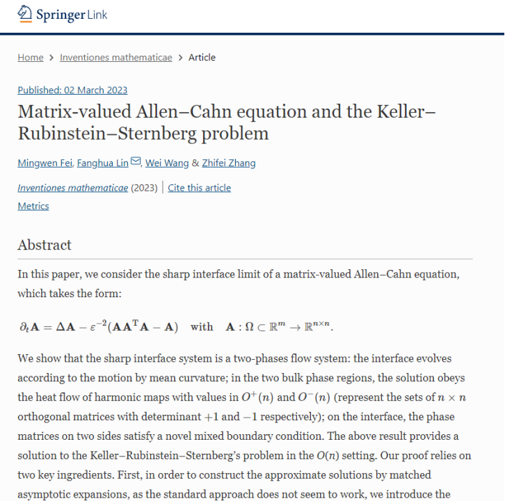 我校优秀校友、浙江大学数学科学学院王伟老师与合作者题为《Matrix-valued Allen–Cahn equation and the Keller–Rubinstein–Sternberg problem》的学术论文近日在国际数学领域四大顶尖刊物之一《Inventiones mathematicae》在线发表。