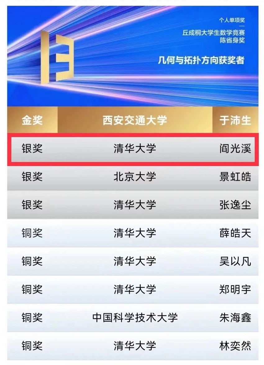 优秀校友阎光溪荣获第13届丘成桐大学生数学竞赛陈省身奖