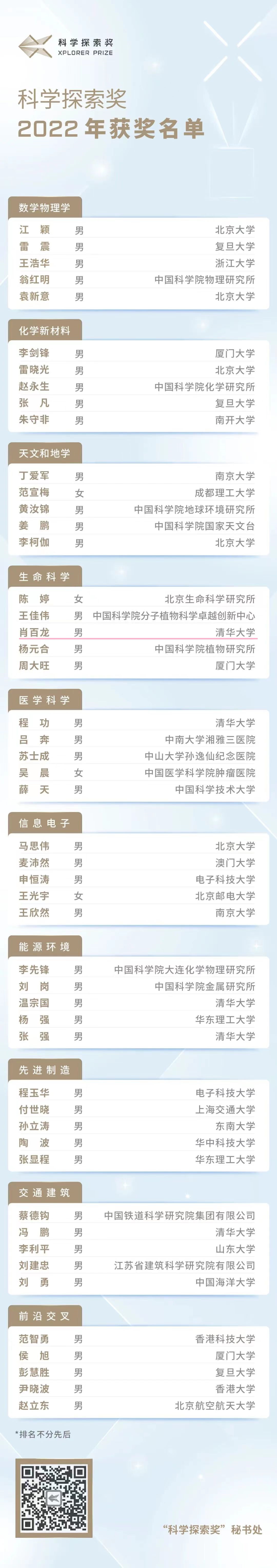 9月15日,备受瞩目的第四届“科学探索奖”获奖名单正式揭晓,国内50位青年科学家榜上有名,首位“90后”获奖人诞生,并评出首批医学科学领域获奖人。每位获奖人将在5年内获得总计300万元人民币奖金,并且可以自由支配奖金的使用。其中包括我校优秀校友、清华大学肖百龙教授。