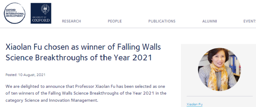 我们很高兴地宣布,傅晓岚教授,被选为2021年 Falling Walls国际跨界创新科学突破大奖科学创新管理类别(Science and Innovation Management)的十名获奖者之一。