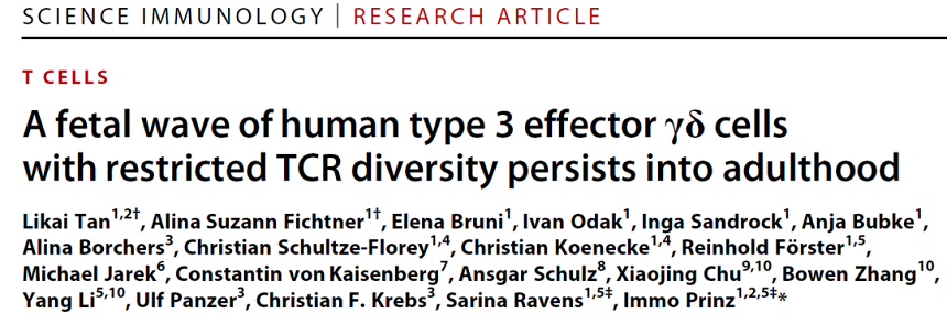 4月23日,德国汉诺威医科大学以及汉堡大学Eppendorf医学中心的Immo Prinz教授团队和Sarina Ravens教授团队(共同第一作者为谭力凯博士和Alina Fichtner博士)在Science Immunology上发表论文A fetal wave of human type-3 effector γδ T cells with restricted TCR diversity persists into adulthood,提出了先天性III型γδT细胞直接发育于早期胚胎胸腺并在外周中留存的证据。