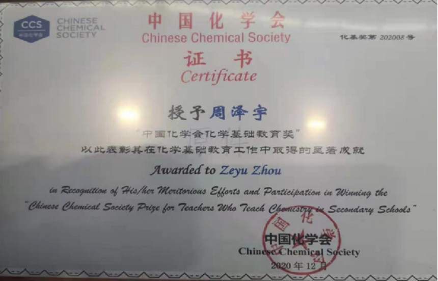 中国化学会举办的第32届学术年会上,我校化学教研组组长周泽宇老师荣获“2020年度中国化学会化学基础教育奖”。我校高0001班毕业的优秀校友、华南理工大学材料科学与工程学院教授、博士生导师胡蓉蓉荣获“2019年度中国化学会青年化学奖”。胡蓉蓉校友就读高中期间入选国家队在希腊雅典获35届国际中学生化学奥林匹克竞赛金牌,并荣获世界女子第一名,指导老师周泽宇。