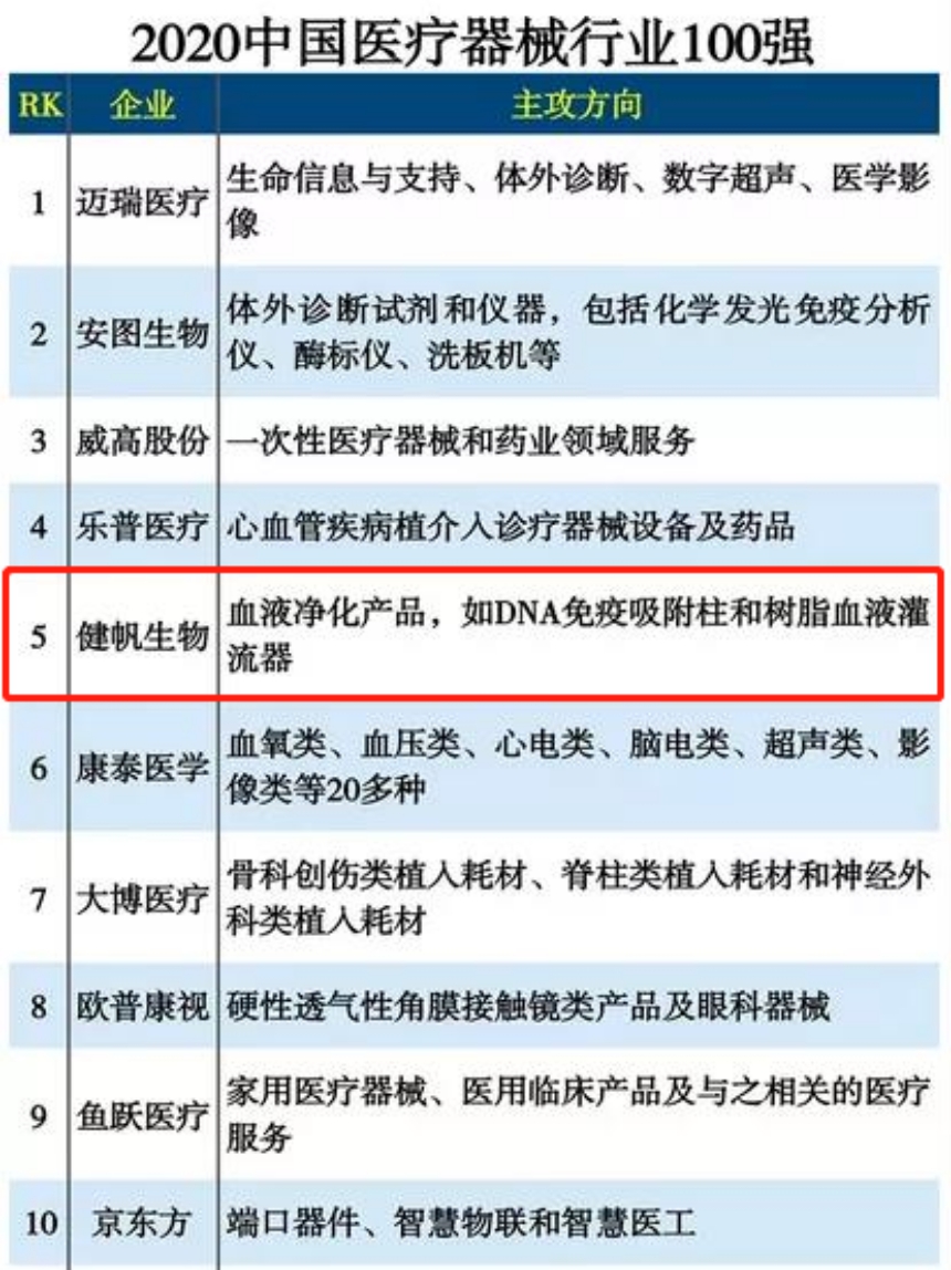 董凡的经历并非一两段文字便可概括,珠海健帆生物科技股份公司的前身是珠海人熟悉的成立于1989年的丽珠制药集团的全资子公司至2002年因为一直亏损,丽珠集团决定止损关门。此时,董凡带领60名职工买断公司产权开启了创业的征程并重新定位将血液灌流器产品作为了主要业务发展,十多年前健帆血液灌流器产品,只适用于中毒的救治,且有欧洲、日本知名厂商的同类竞争产品。在这种市场环境下,健帆不断开发和完善的产品技术并逐渐在血液灌流领域的科研水平一直位于世界前列。2009年,健帆“高性能血液净化医用吸附树脂的创制”,获得国家科技进步二等奖,填补了国际国内的空白,也让它坐拥“血灌之王”的宝座。2010、2011年蝉联“福布斯中国潜力企业百强榜”,2011年被认定为“国家火炬计划重点高新技术企业”,是全国首批、广东省第二家通过医疗器械GMP检查的企业,而后企业逐渐扭亏为盈并在2016年A股创业板上市。直至2020年健帆用了四年时间让股价涨幅超过10倍,也凭借14亿元营收,就支撑起了600亿元的市值。在近日发布的“2020中国医疗器械行业100强榜单”中,健帆生物入榜,位列全国第五名。
