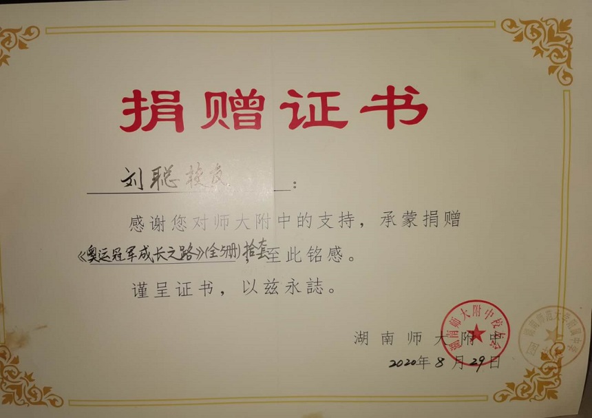 刘聪校友介绍到,这套书出版之后,她给易红芝老师寄了一套。易老师收到书之后反馈她说:“这是一套励志的书,书中奥运冠军的故事能够激励我们的学生,也能成为很好的写作素材,希望能够给学校图书馆寄一些。”听到这个建议,刘聪特别开心,她说:“这些年,都没有能力为母校做一点点小事,这次终于有一个机会了。”她还回忆道:“在母校,易红芝老师是她的高中语文老师,虽然多年未见,但她当年教授的语文基础知识,指导我们养成的阅读习惯让我受益至今,甚至每一天的工作都与她当年的教导息息相关。我的每一位老师都非常尽力地帮助我、指导我。感谢母校和老师们!”