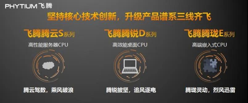 2020 年上半年,为了更加针对性地服务好行业客户,飞腾公司对三大产品谱系(高性能服务器 CPU、高效能桌面 CPU、高端嵌入式 CPU)进行了全面的品牌升级,凝聚核心价值,打造全新极致体验。窦强介绍,高性能服务器CPU产品线统一以飞腾 腾云S系列 进行命名,寓意 “ 腾云驾数,乘风破浪 ”,为服务器和数据中心应用提供强算力、高并发的计算能力;高效能桌面CPU产品线统一以飞腾 腾锐D系列 进行命名,寓意 “ 腾锐披坚,追风逐电 ”,打造高性能、高安全的单用户极致体验;高端嵌入式CPU产品线统一以飞腾 腾珑E系列 进行命名,寓意 “ 腾珑灵动,烈风迅雷 ”,提供定制化的、契合各行各业嵌入式应用的解决方案。