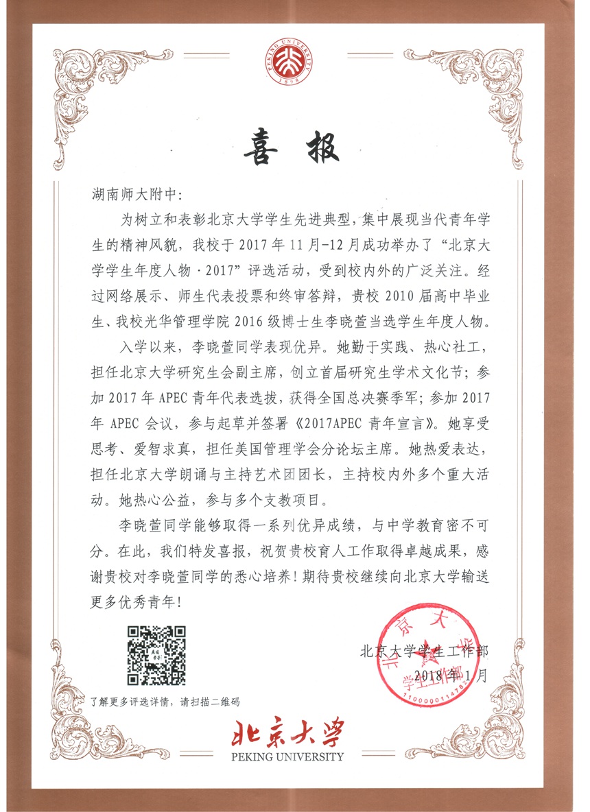 近日,我校校友李晓萱荣获2017年北京大学“学生年度人物”。 李晓萱,我校2010届毕业校友,北京大学光华管理学院在读博士,现任北京大学研究生会副主席,曾任湖南省学联主席,被评为2017年北京大学年度人物,曾作为青年代表参加2017年APEC会议,入选联合国气候大会青年代表,作为青年代表参加央视《开讲啦》。