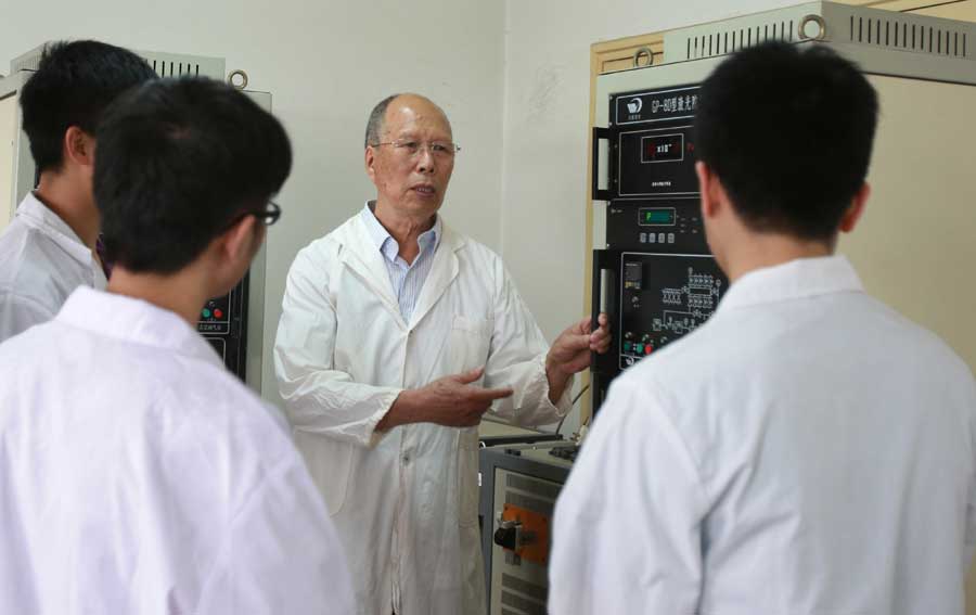 再一个就是他那干起工作来是“拼命三郎”,在早些时候,夏天没有风扇、空调,他就穿件背心,一身是汗的反复做实验,搞研究,冬天就裹着大衣守在实验机器旁,就这样扎在一个项目里三十多年,这在学校乃至全国都是少有的。