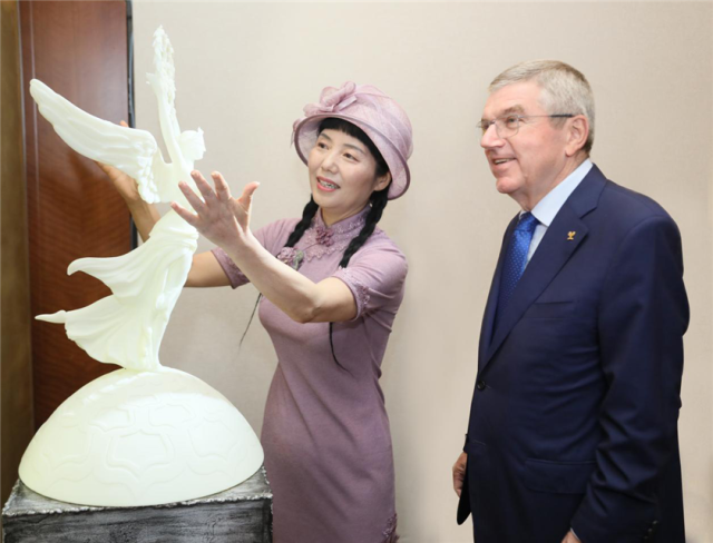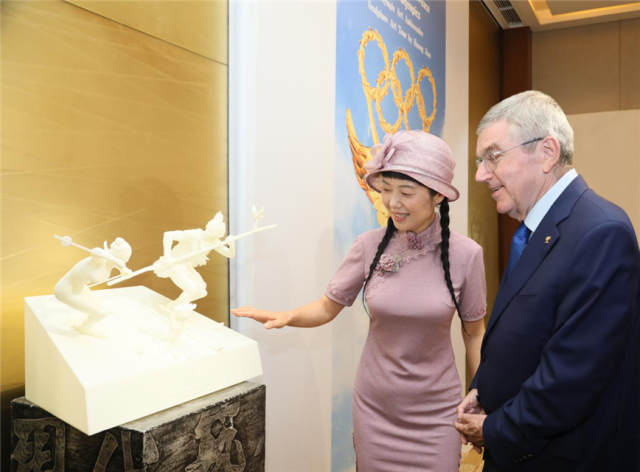 巴赫还观看了雕塑《中瑞滑雪友谊赛》,该作品是为2020年洛桑冬青奥会创作的音乐动态雕塑,塑造了一位中国远古滑雪少年穿越时空,与瑞士高山滑雪奥运冠军和吉祥物尤迪力,欢聚于洛桑冬青奥会。滑雪最早起源于中国,瑞士将其发扬光大并成为现代滑雪王国,作品充分体现了中瑞两国一脉相承的体育文明。作品的奇幻构思和丰富文化内涵让巴赫主席赞不绝口,他表示将把作品推荐给瑞士政府,为洛桑冬青奥会增光添彩。